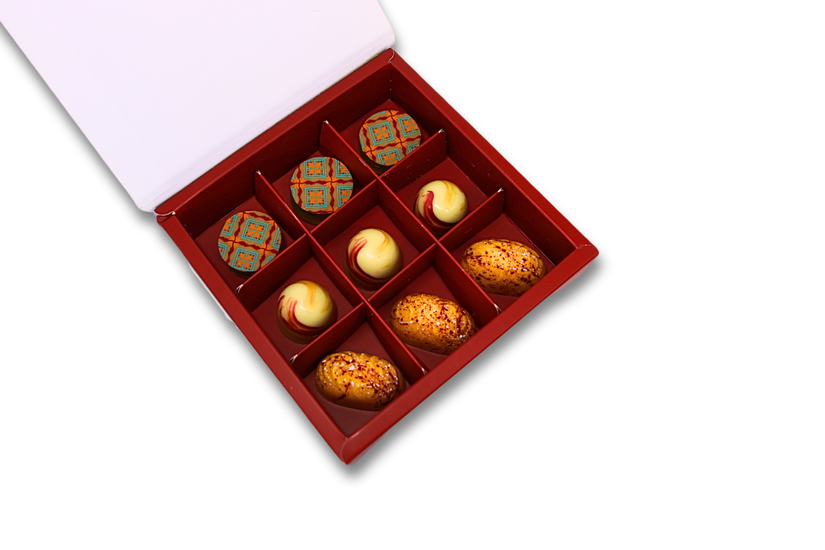 A Chocolate praline offers a delightful assortment of artisanal pralines, each featuring a smooth, creamy filling enveloped in a delicate shell of white chocolate. This curated collection showcases bold and exotic flavors that excite the palate and please the eye. Here's a detailed description: