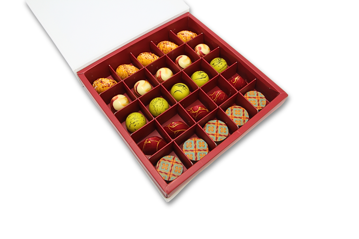 A Chocolate praline offers a delightful assortment of artisanal pralines, each featuring a smooth, creamy filling enveloped in a delicate shell of milk and white chocolate. This curated collection showcases bold and exotic flavors that excite the palate and please the eye. Here's a detailed description: