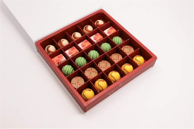 A Chocolate praline offers a delightful assortment of artisanal pralines, each featuring a smooth, creamy filling enveloped in a delicate shell of white chocolate. This curated collection showcases bold and exotic flavors that excite the palate and please the eye. Here's a detailed description:
